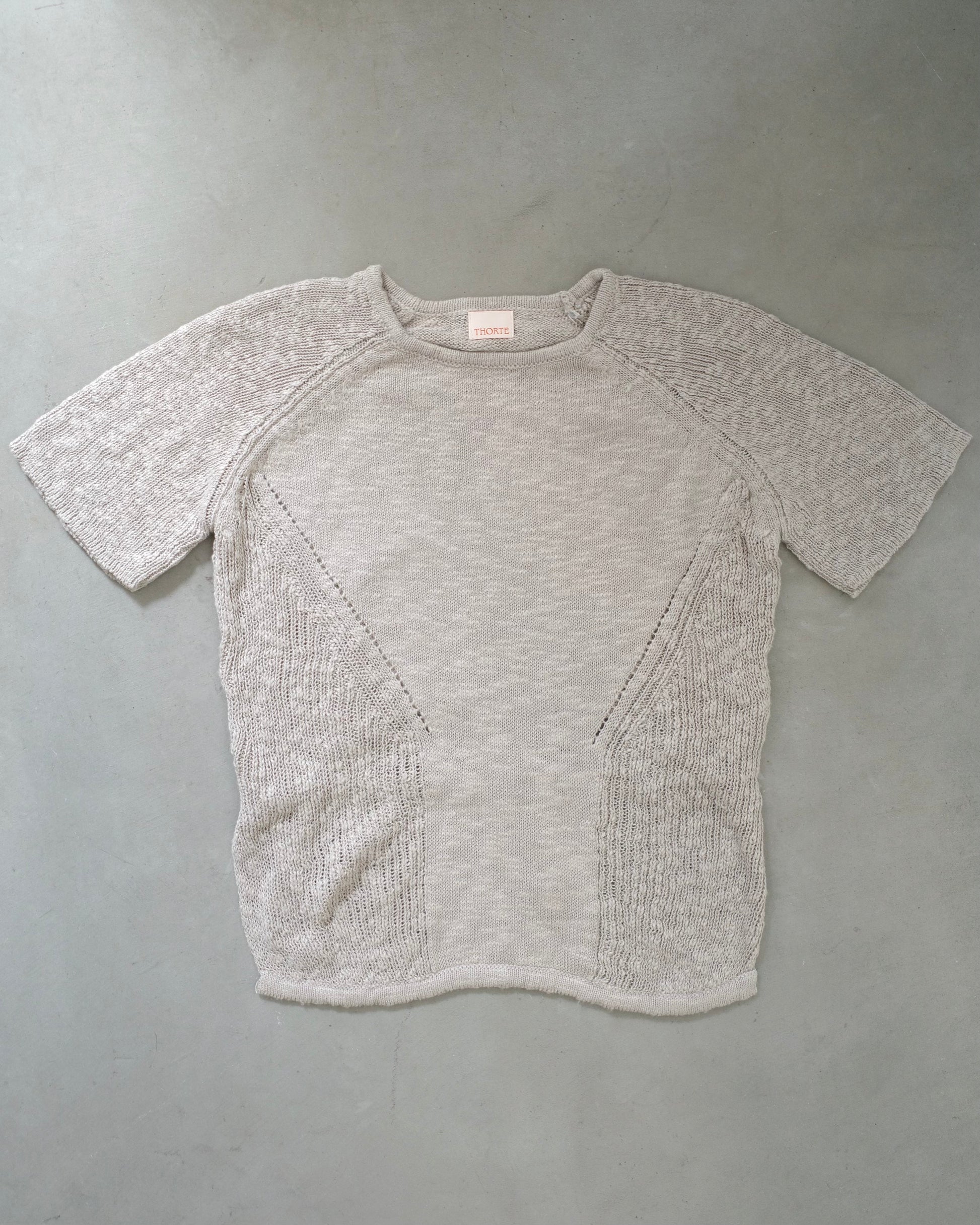 柔らかい肌あたりで、表情のあるスラブニットを使用しており、シンプルながらもデザイン性があり、ハイウエストのボトムスやスカートとも相性の良い丈感です。