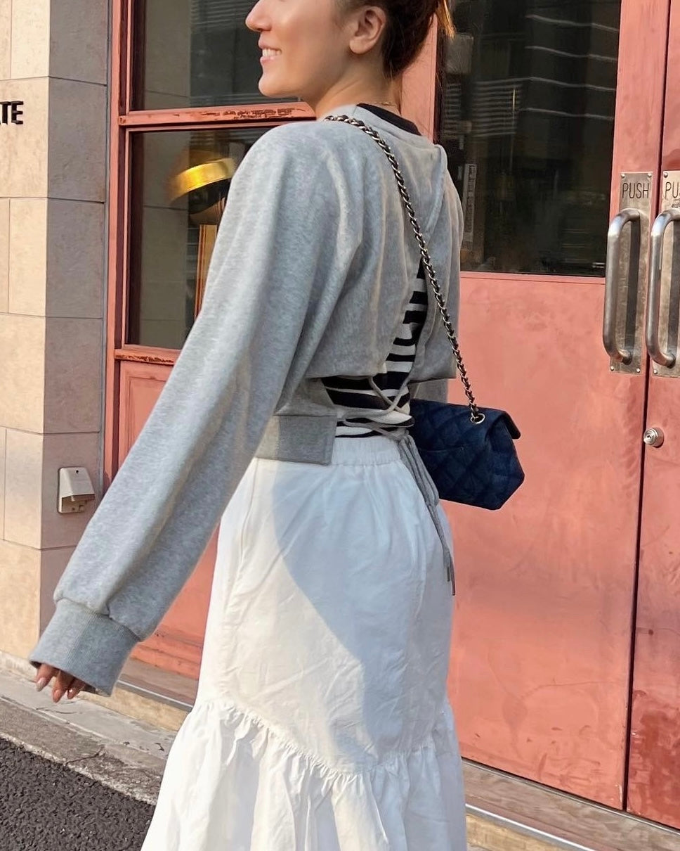 バックスタイルのレースアップがポイントのスウェット。腕