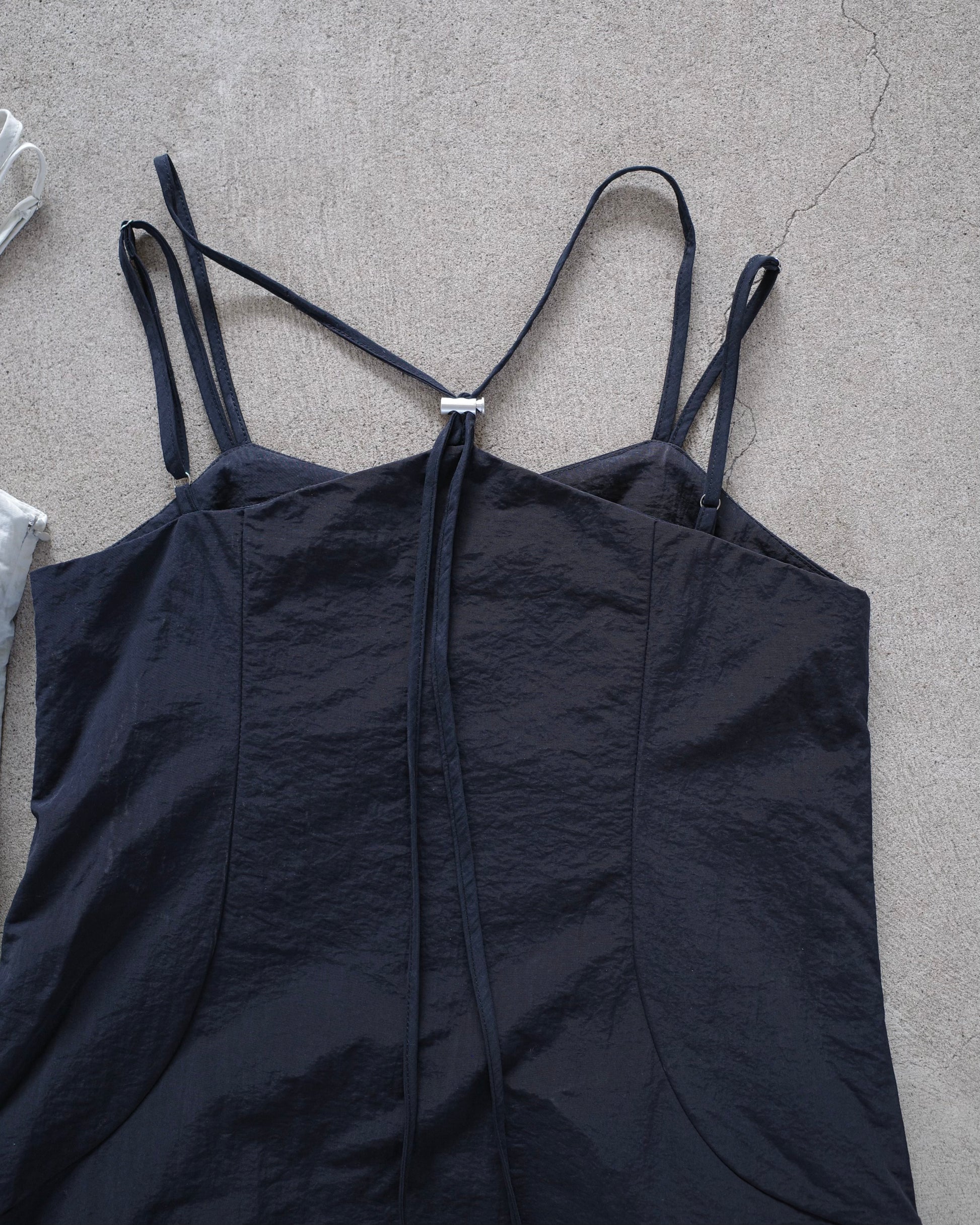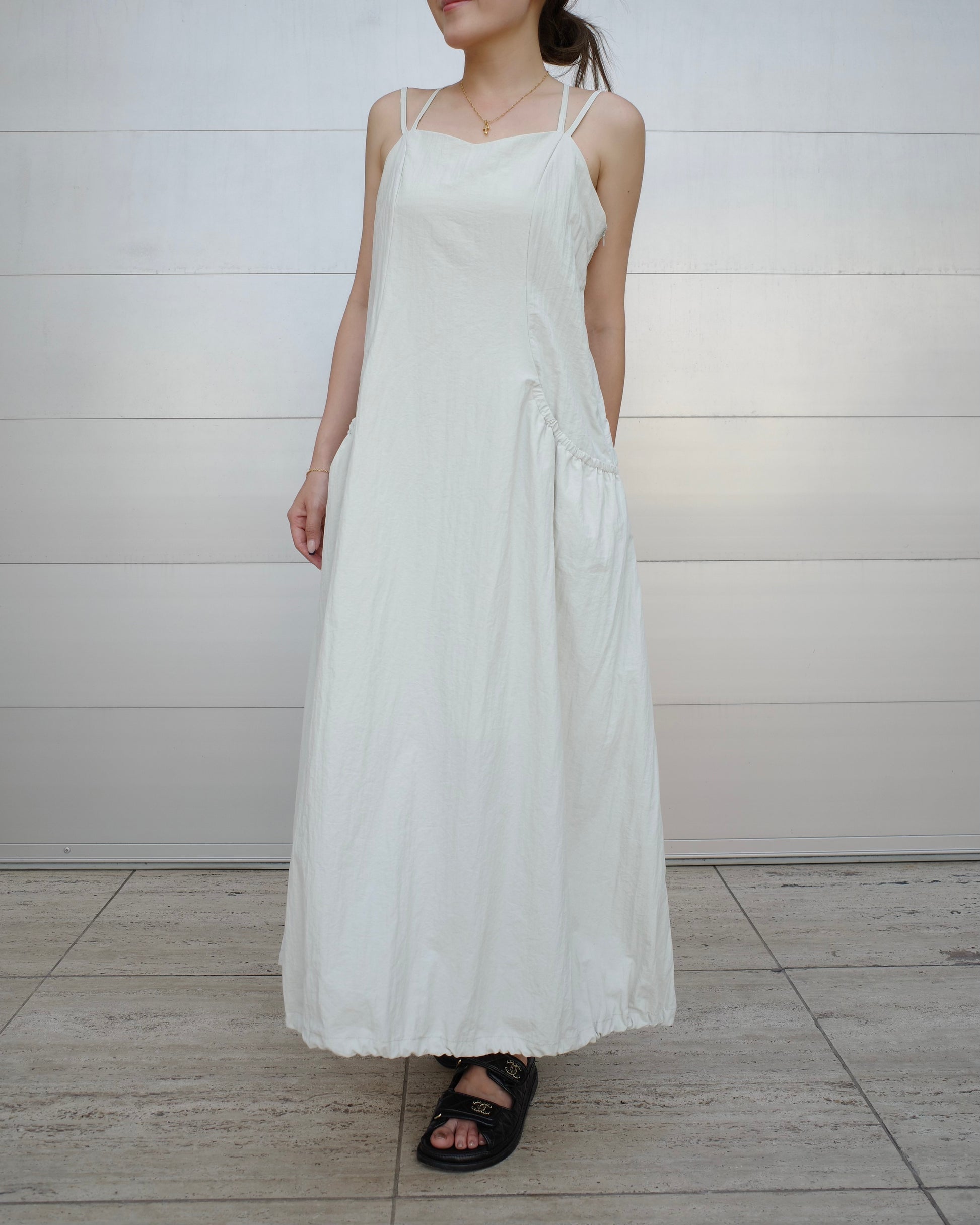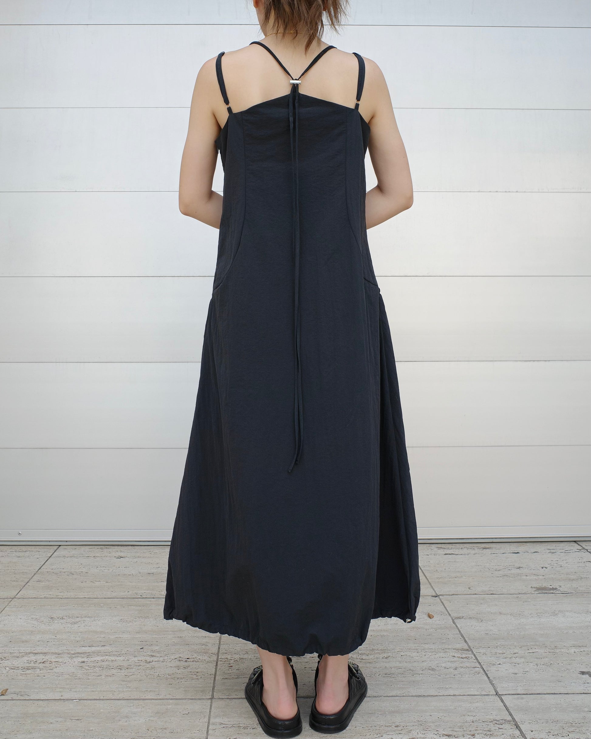 肩紐とバックスタイルのドロストリングで長さを調節でき、丈は足首が見える長さでさまざまなシューズで合わせやすく、インナーにタンクトップやシアーロングTシャツのご着用もおすすめです。インナーを合わせて長いシーズンご着用いただけるコットンナイロン素材でご用意いたしました。