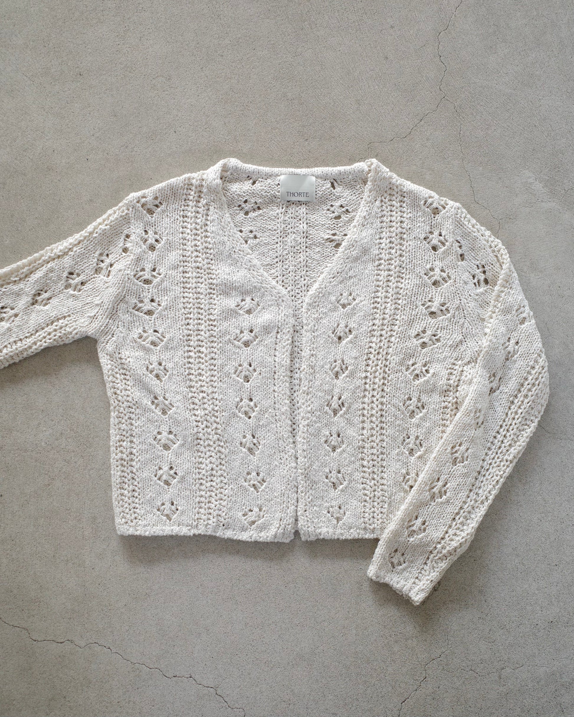 デザインの入った鍵編みが目を惹くカーディガンの登場です。