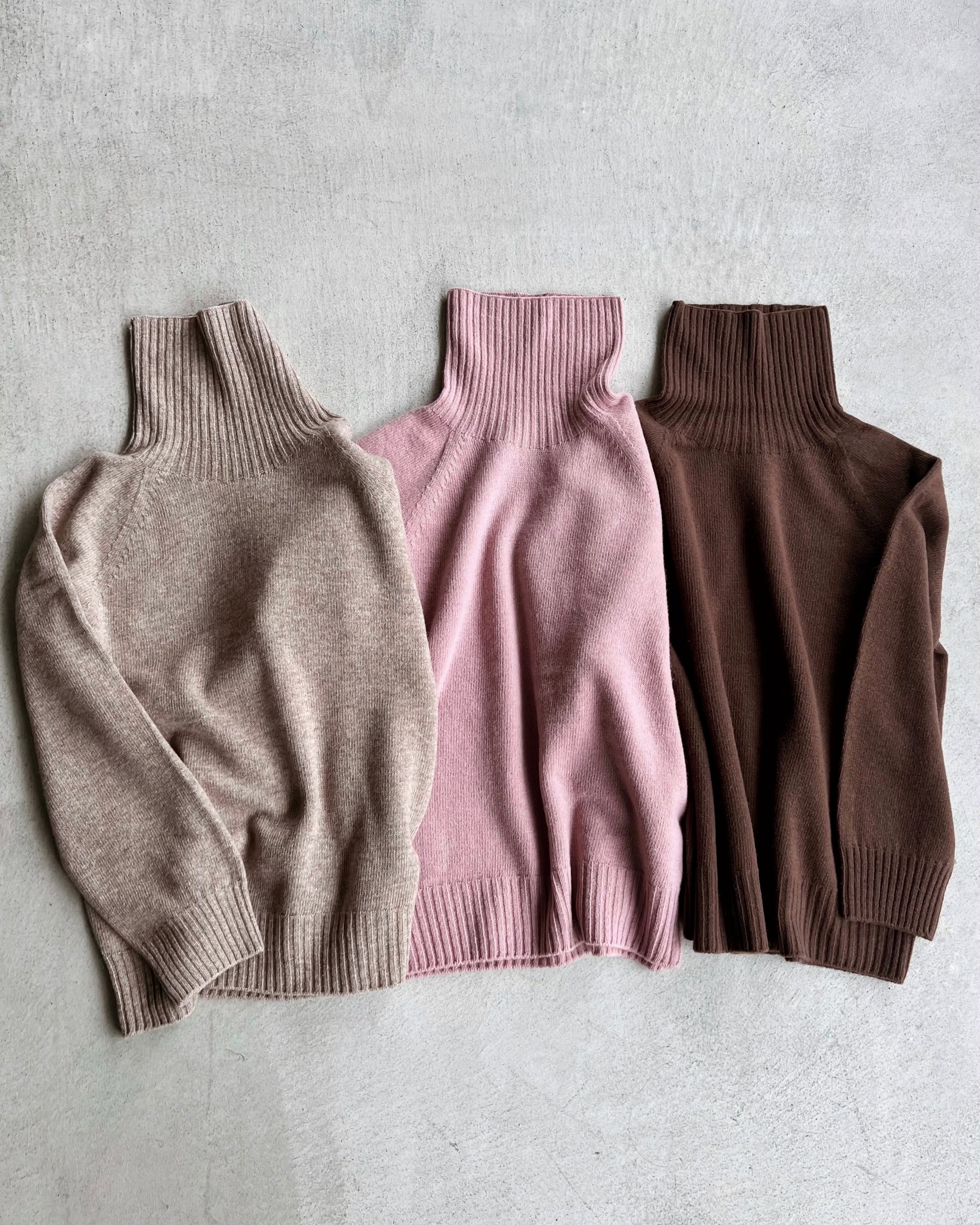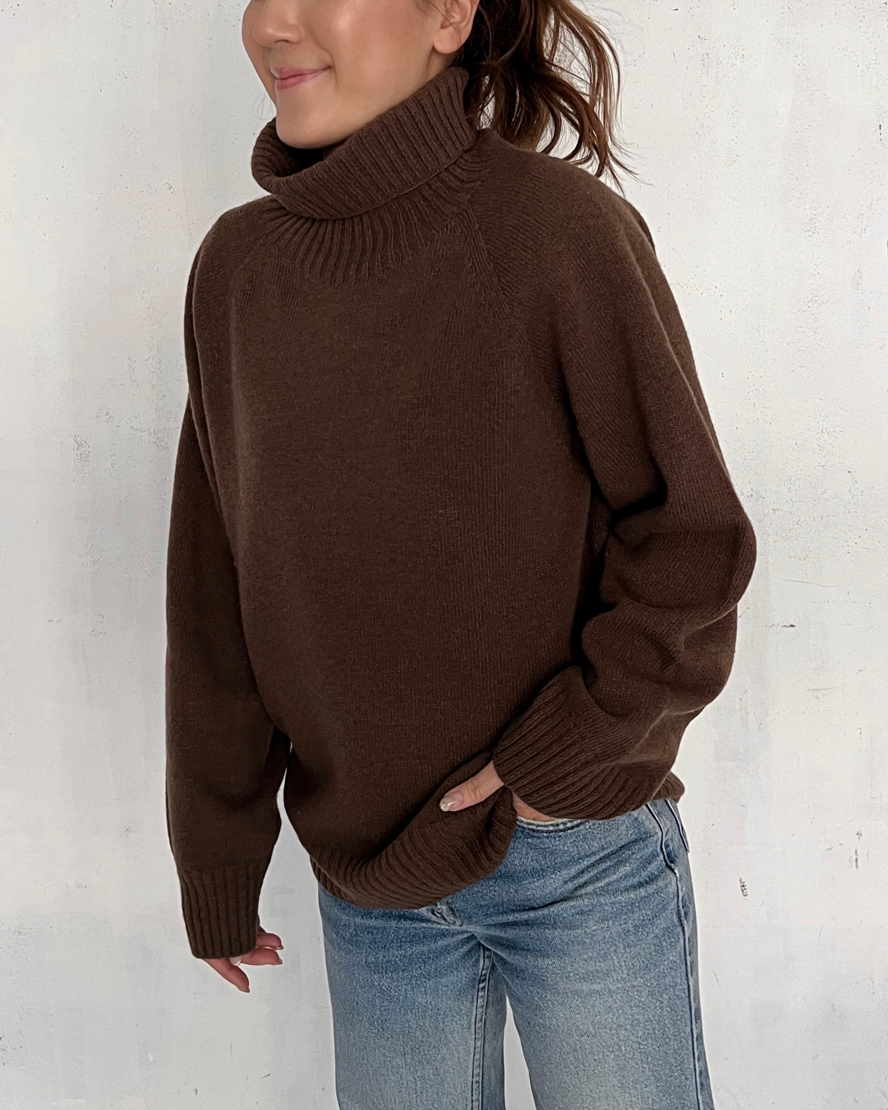 軽く暖かなウール素材を使用したハイネックニット。
