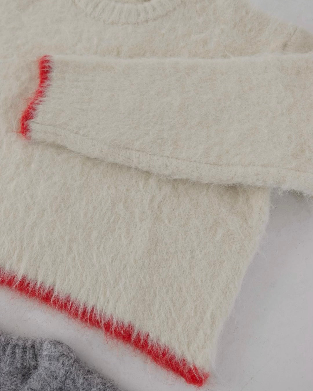カラーラインが目を惹く、長めの毛足が魅力のシャギーニットの登場です。